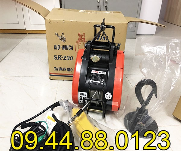 - Tời treo Kio Winch Kio SK230 30m có tải trọng 230kg thuộc dòng tời mini có móc treo vì thế mà nó còn được gọi là tời treo, nguồn điện sử dụng 1 pha 220V 50Hz, đây là thiết bị nâng hạ sử dụng điện năng, nâng vật nặng bằng dây cáp quấn quanh tang quấn thường được sử dụng trong gia đình, các công việc nâng hạ trong đời sống hàng ngày.